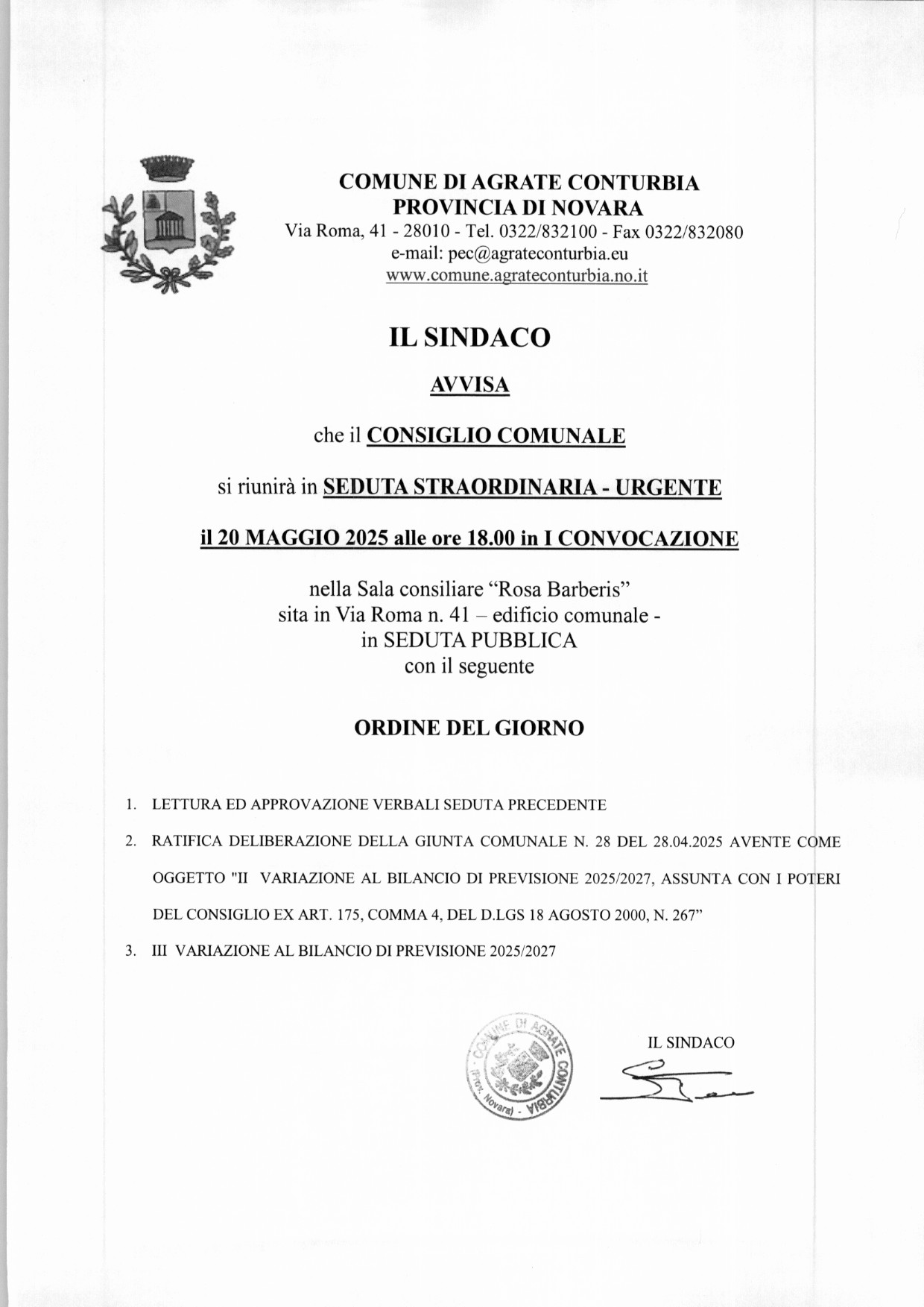 In allegato l'Ordine del Giorno del Consiglio comunale che si terrà il 20/05/2025 - ore 18.00